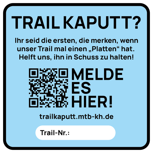 Helft uns, unsere Trails sicher und befahrbar zu halten: Am Anfang und Ende jeder Strecke findet ihr einen QR-Code. Einfach scannen, eine Nachricht schreiben – und so direkt Schäden oder Probleme melden. Je schneller wir Bescheid wissen, desto schneller können wir handeln.